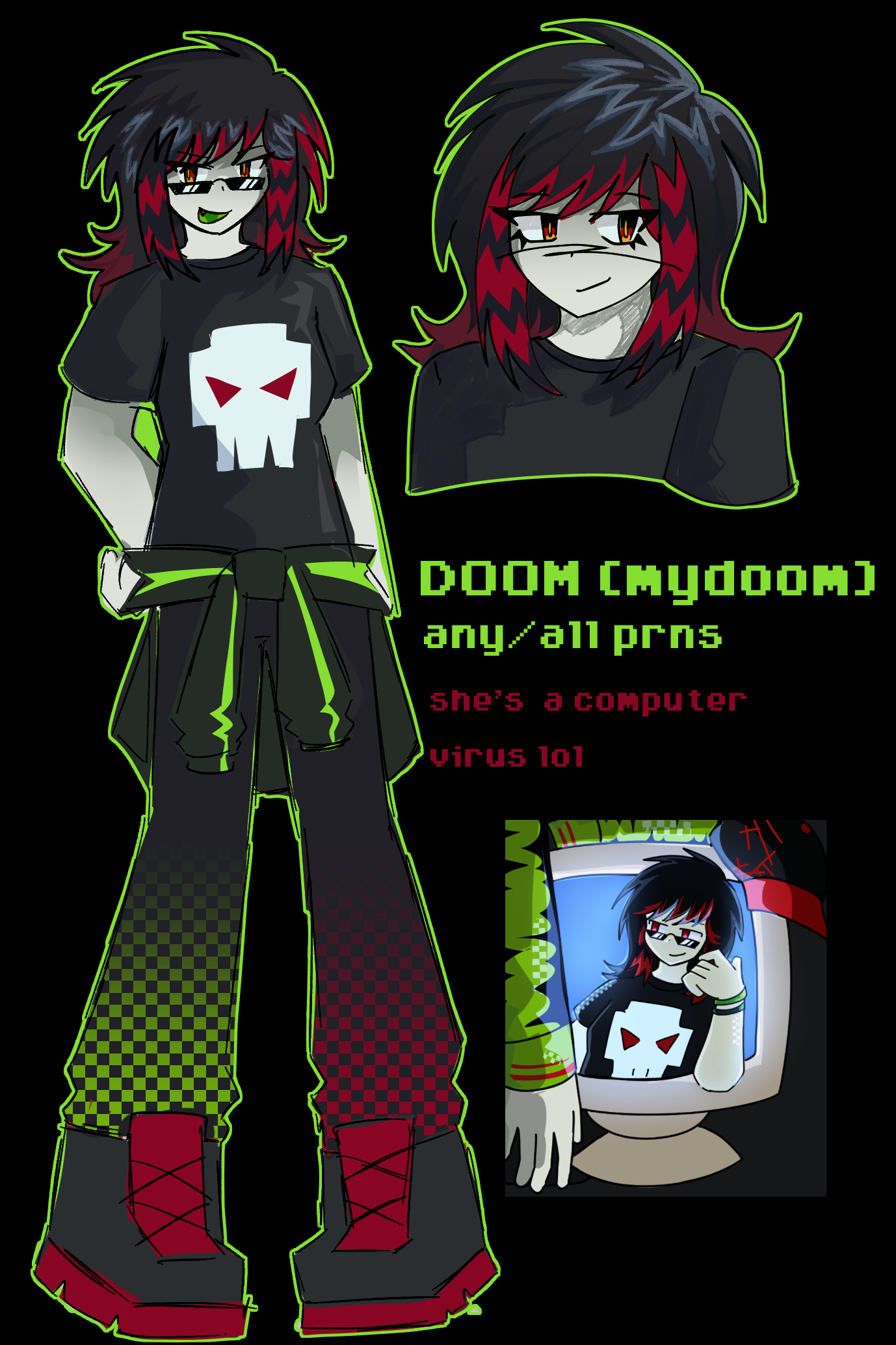 so basically her whole thing is that she's a computer virus. i really like computer viruses i think they're really interesting, she's based off mydoom. also she represents me